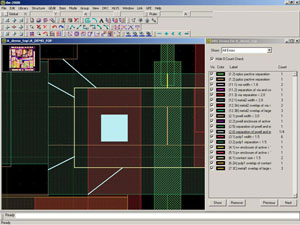 どこでどんな種類のエラ−が起きたかを瞬時に視覚的に認識できるよう、DRCスクリプト内にエラ−の種類に応じてユ−ザ−サイドでカラ−を設定することが出来ます。さらに、エラーの内容に応じた分かり易い名称をラベルとして定義することができますので、エラー箇所を容易に認識することができます。これにより設計者はどこでどんな問題が起きているのかを瞬時に判断し対処できることで、設計効率の大幅な向上を図ることが出来ます。